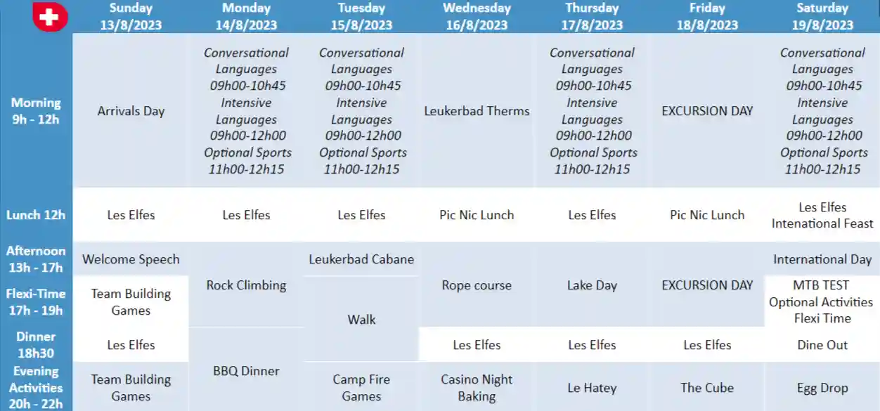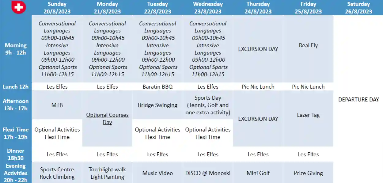 Morning: Breakfast, Language lessons, and sports/games.